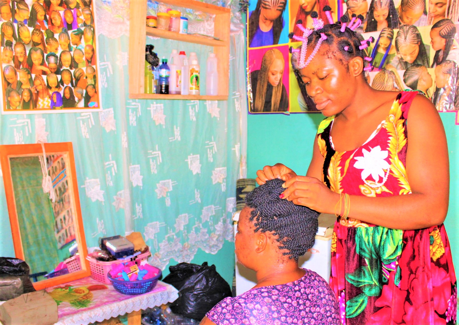 Lorsque vous arrivez dans l’atelier de coiffure de Christine sis à Pagouda, vous êtes tout d’abord accueilli par son immense sourire. Elle est une ancienne volontaire d’engagement citoyen de la phase 7, qui se démarque des autres femmes rencontrées dans le monde de la coiffure. Contrairement à ces dernières, Christine a abandonné la coiffure féminine pour se tourner vers la coiffure masculine, se spécialisant ainsi dans les coupes de cheveux pour hommes.