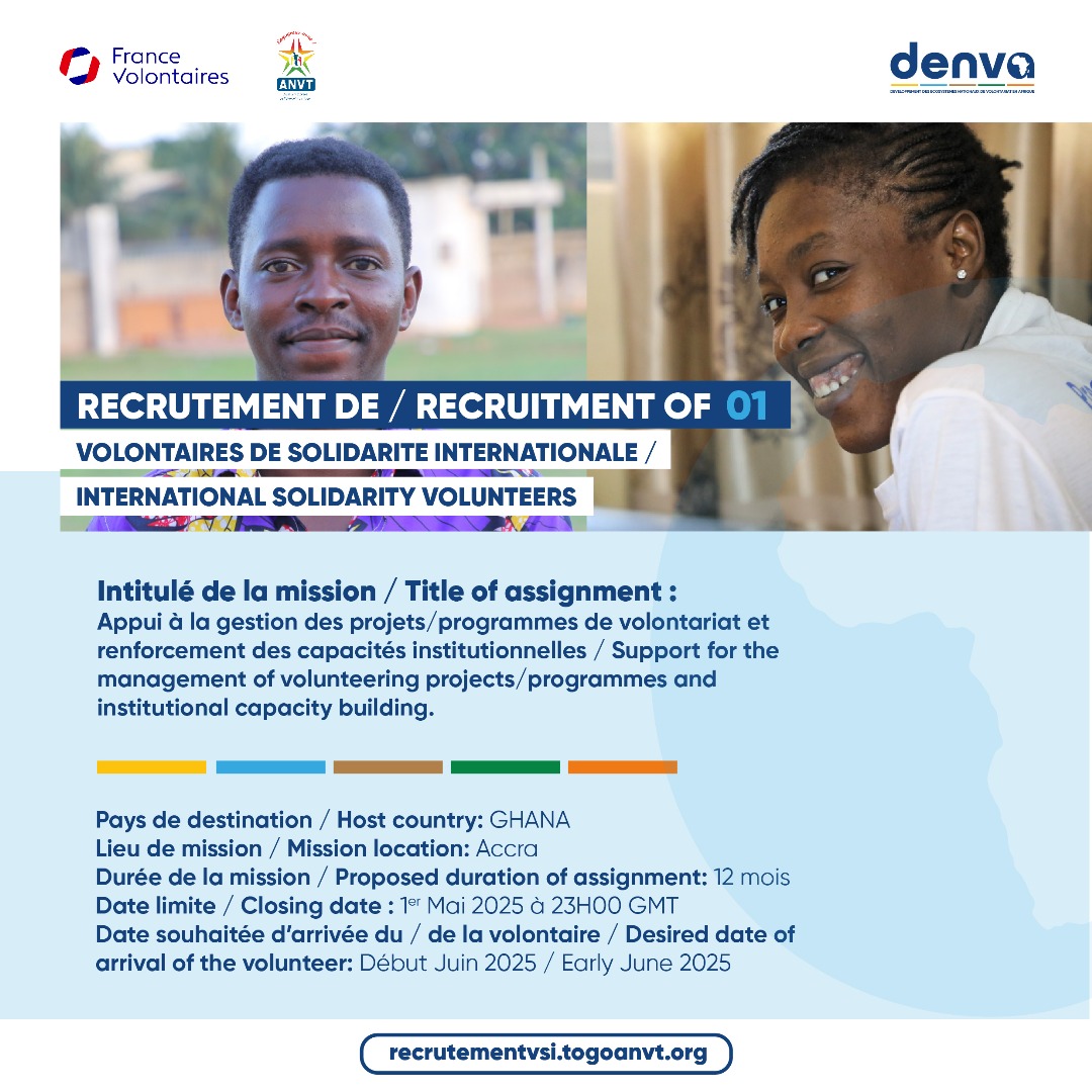 25 avril 2025Are you young, dynamic, passionate about discovery, and would you like to get involved internationally? Agence Nationale du Volontariat au Togo (ANVT) and France Volontaires are offering you this opportunity as part of Développement des Ecosystèmes de Nationaux de Volontariat en Afrique (DENVA) programme.