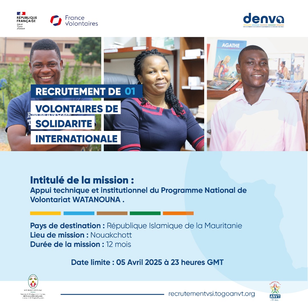 25 mars 2025Vous êtes jeunes, dynamiques, passionné(e)s par la découverte, et vous souhaitez vous engager à l’international ? L’Agence Nationale du Volontariat au Togo (ANVT) et France Volontaires, vous offre cette occasion dans le cadre de la mise en œuvre du programme DENVA.